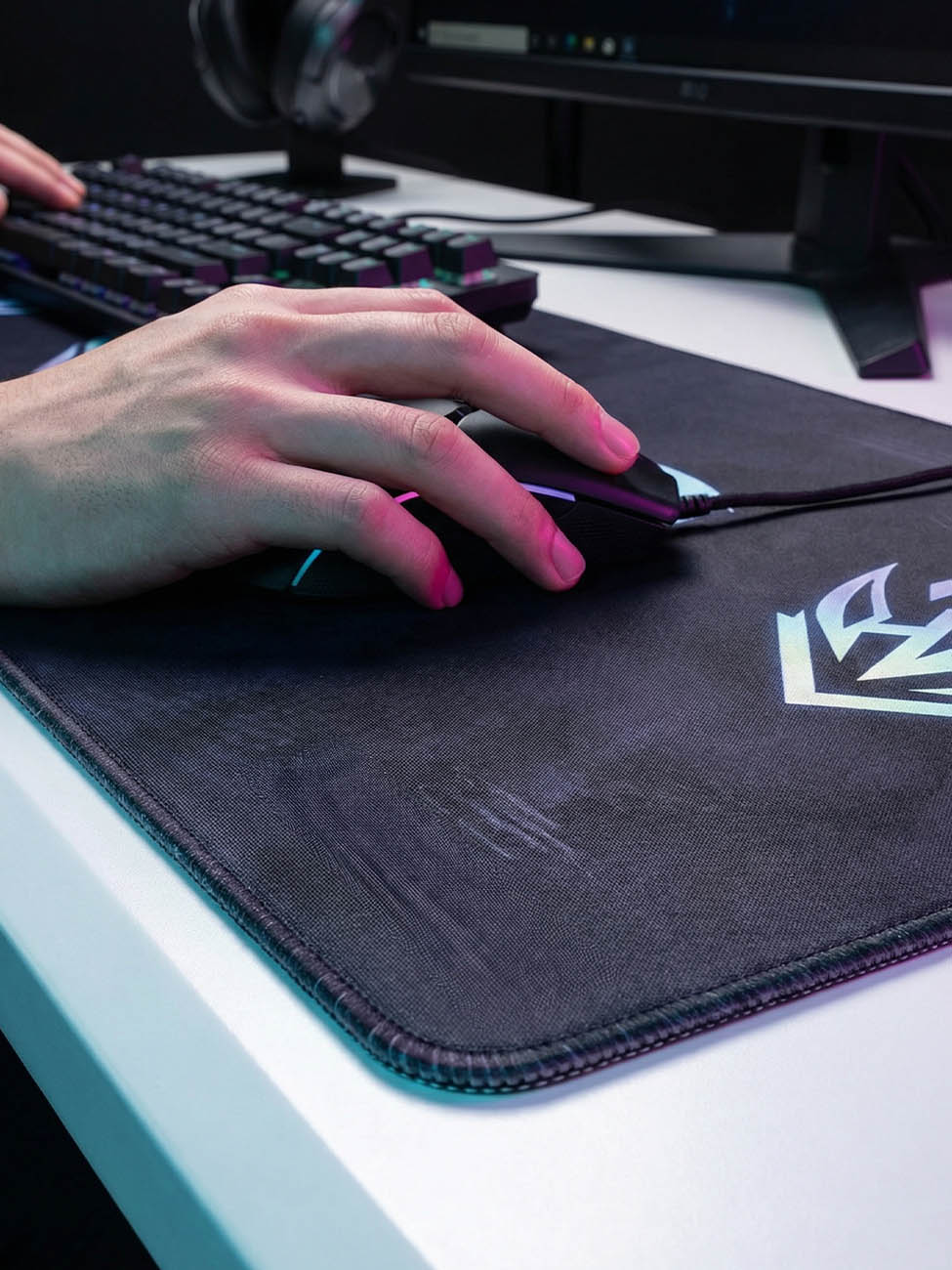 Offrez-vous le bien-être visuel dont rêve chaque Blade. Le design noir profond aux touches bleues et violettes crée un environnement immersif unique, inspiré du luxe sombre d'Evelynn. Doux au toucher mais redoutable d'efficacité, ce tapis protège votre poignet tout en sublimant votre bureau.