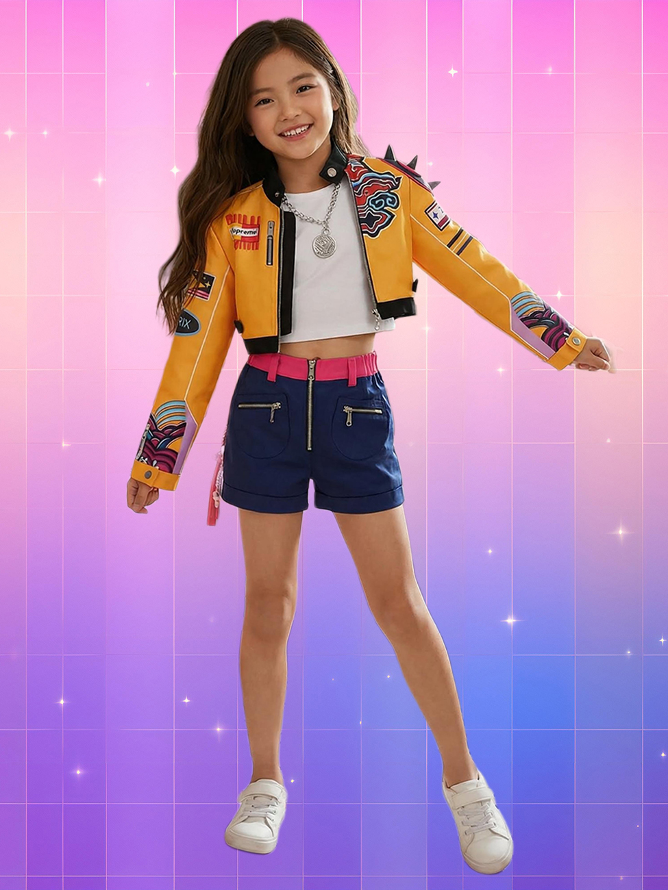 Ce déguisement reproduit fidèlement la tenue de combat de Rumi, leader des Huntrix. La veste crop jaune doré arbore les patchs brodés emblématiques du film, des pointes audacieuses sur les épaules et des rayures graphiques aux manches.