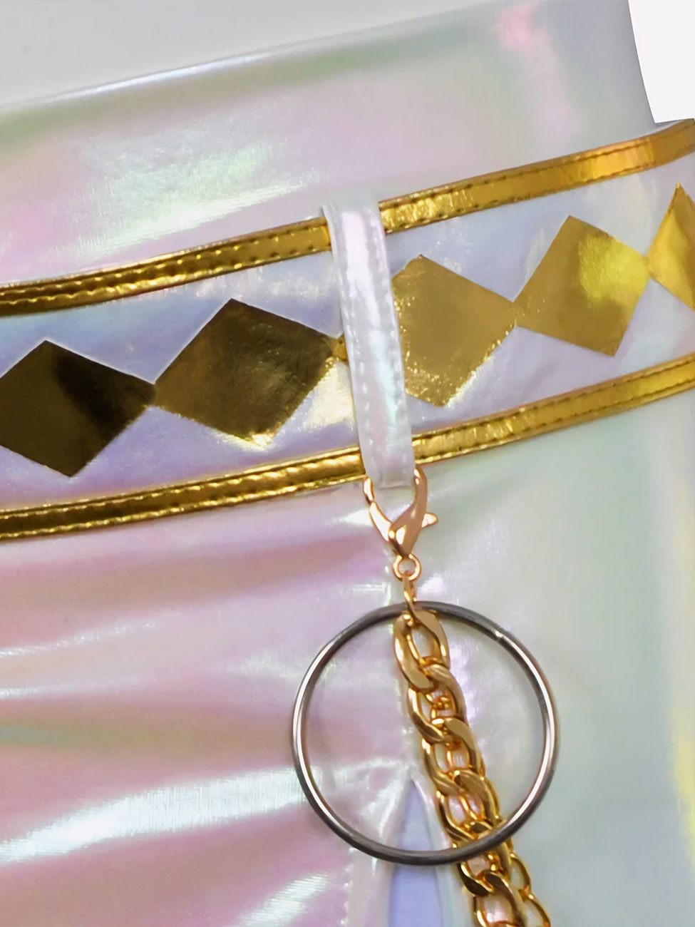 Le polyester holographique garantit que chaque mouvement de danse hip-hop scintille intensément. Le collier doré, les grandes créoles, la ceinture à motifs géométriques et les chaînes dorées décoratives recréent fidèlement l'arsenal complet de Zoey en concert.