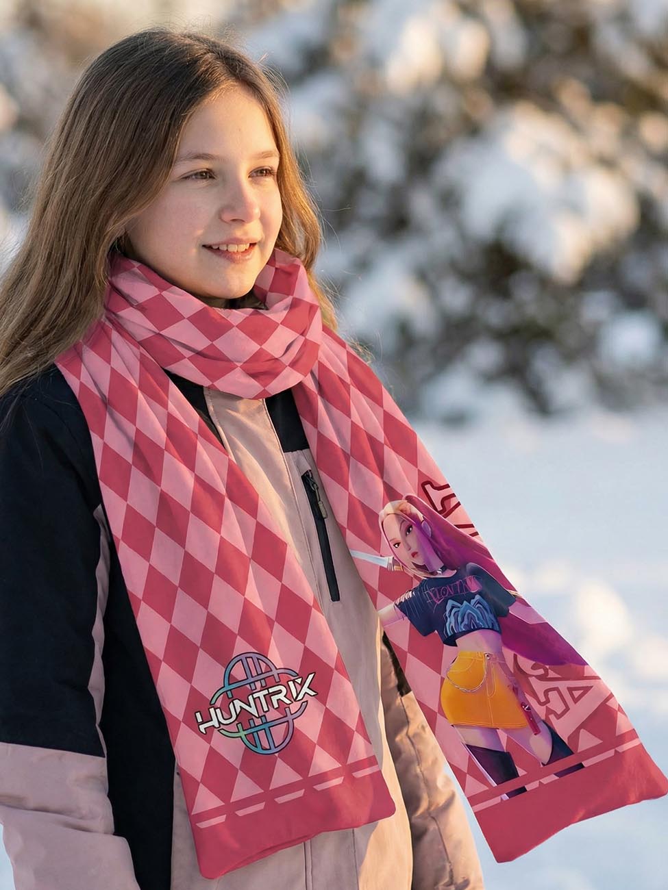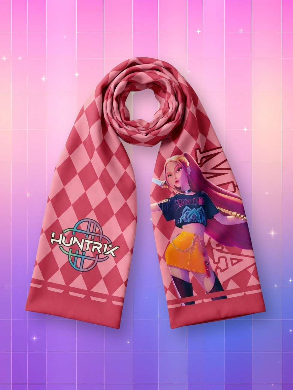 L'écharpe déploie un motif à carreaux en losanges, créant cet effet visuel dynamique qui évoque l'énergie du personnage. D'un côté, le logo "HUNTR/X" stylisé rappelle l'identité du groupe légendaire. De l'autre, Mira apparaît dans sa tenue du quotidien.