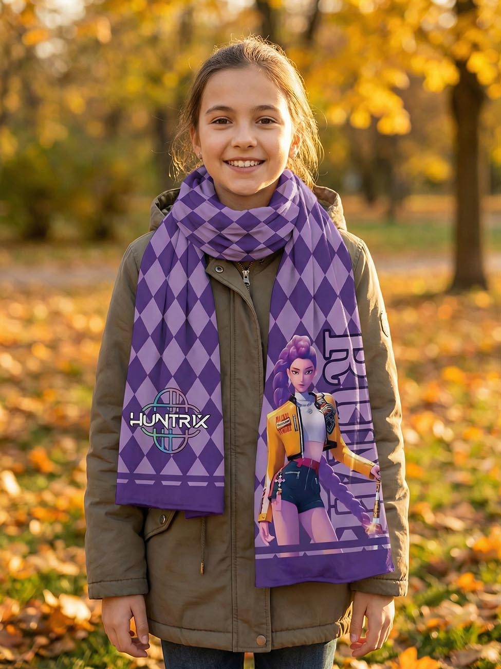 L'écharpe déploie le motif à carreaux en losanges alternant violet foncé et lavande clair. D'un côté, le logo "HUNTR/X" stylisé affirme l'appartenance au groupe. De l'autre, Rumi apparaît dans sa tenue quotidienne : veste orange et jaune iconique, crop top blanc et cheveux violets en chignon.