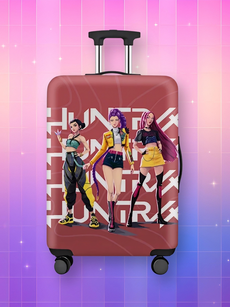 Les logos "HUNTR/X" rรฉpรฉtรฉs en arriรจre-plan crรฉent cet impact visuel puissant qui fait ressortir sa valise instantanรฉment au tapis roulant, รฉvitant les confusions typiques des bagages standards.