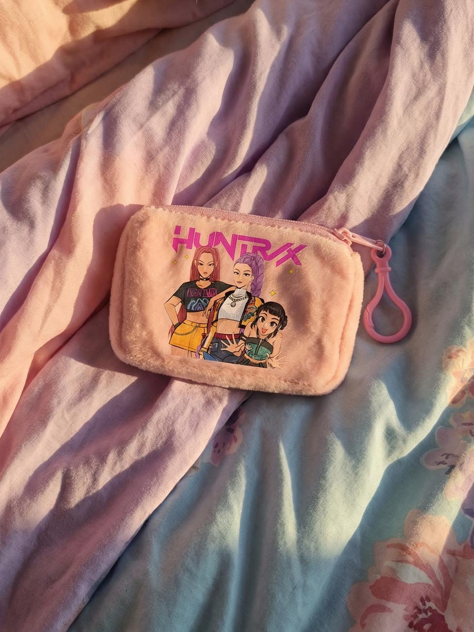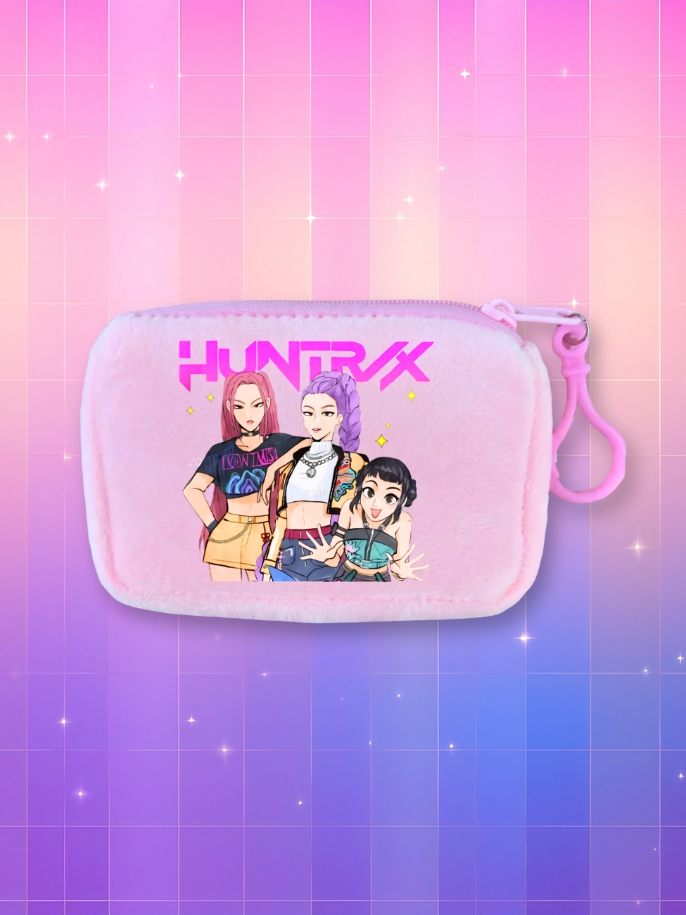 L'impression haute qualité reproduit fidèlement Rumi, Mira et Zoey dans leurs tenues du quotidien. Le logo "HUNTR/X" rose domine la composition avec cette esthétique K-pop moderne qui passionne la génération actuelle.