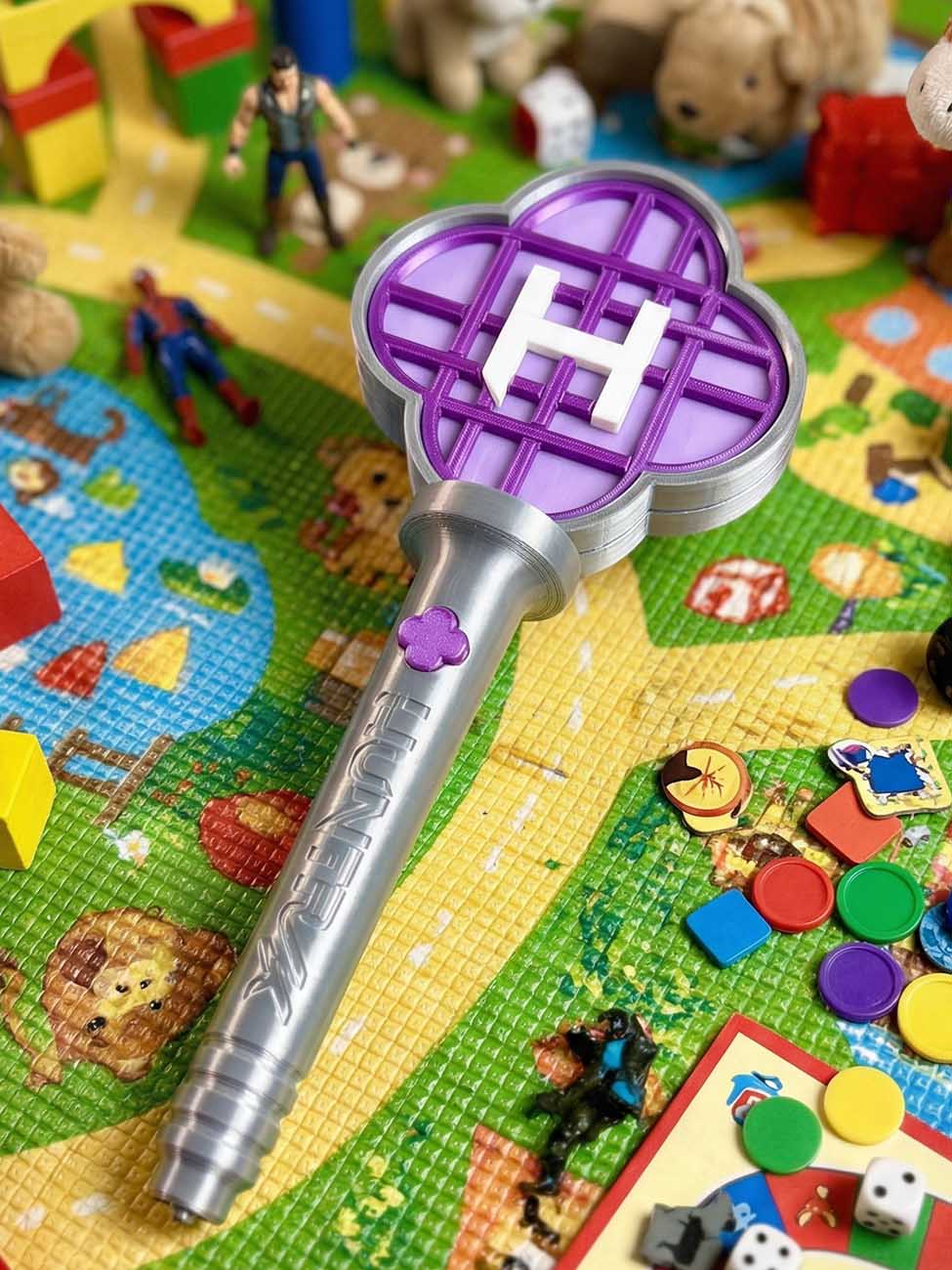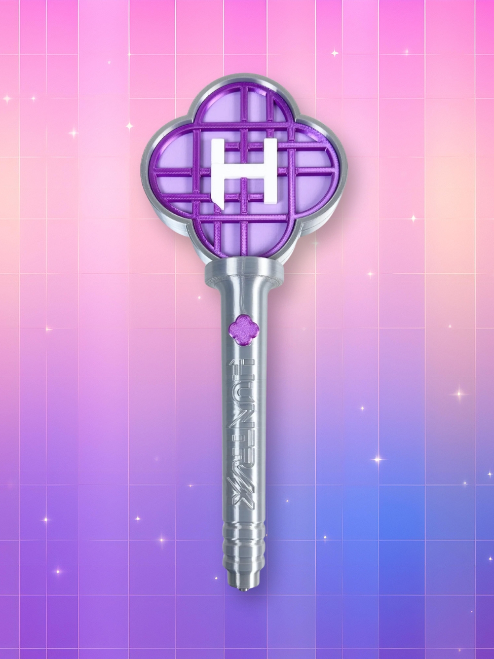 Ce lightstick capture l'identitรฉ visuelle des Huntrix avec sa combinaison violet et argentรฉ caractรฉristique. Le H, tirรฉ du logo du groupe, trรดne fiรจrement sur le dรดme en forme de trรจfle, tandis que le manche argentรฉ affiche รฉlรฉgamment "HUNTR/X" en lรฉger relief.