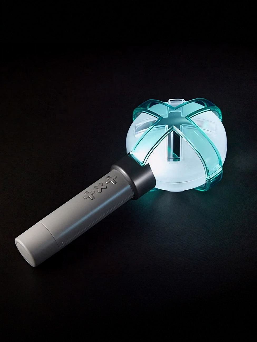 La version 2 de ce lightstick marque un tournant esthรฉtique : les lignes se font plus nettes reflรฉtant la maturation artistique de TXT. La croix turquoise translucide conserve son pouvoir symbolique tandis que les boutons argentรฉs remplacent les touches colorรฉes pour un rendu rรฉsolument contemporain.