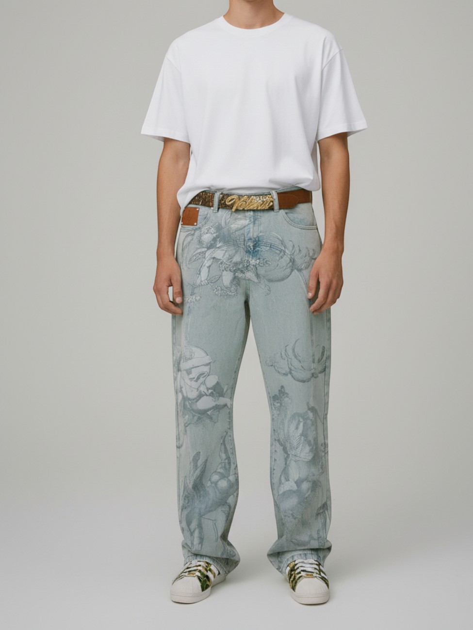 Les motifs artistiques offrent une identité forte et rare au denim bleu clair. L’impression façon gravure crée un contraste marqué avec la coupe ample, donnant un relief visuel singulier. Ce détail transforme la pièce en véritable élément statement, facilement reconnaissable.