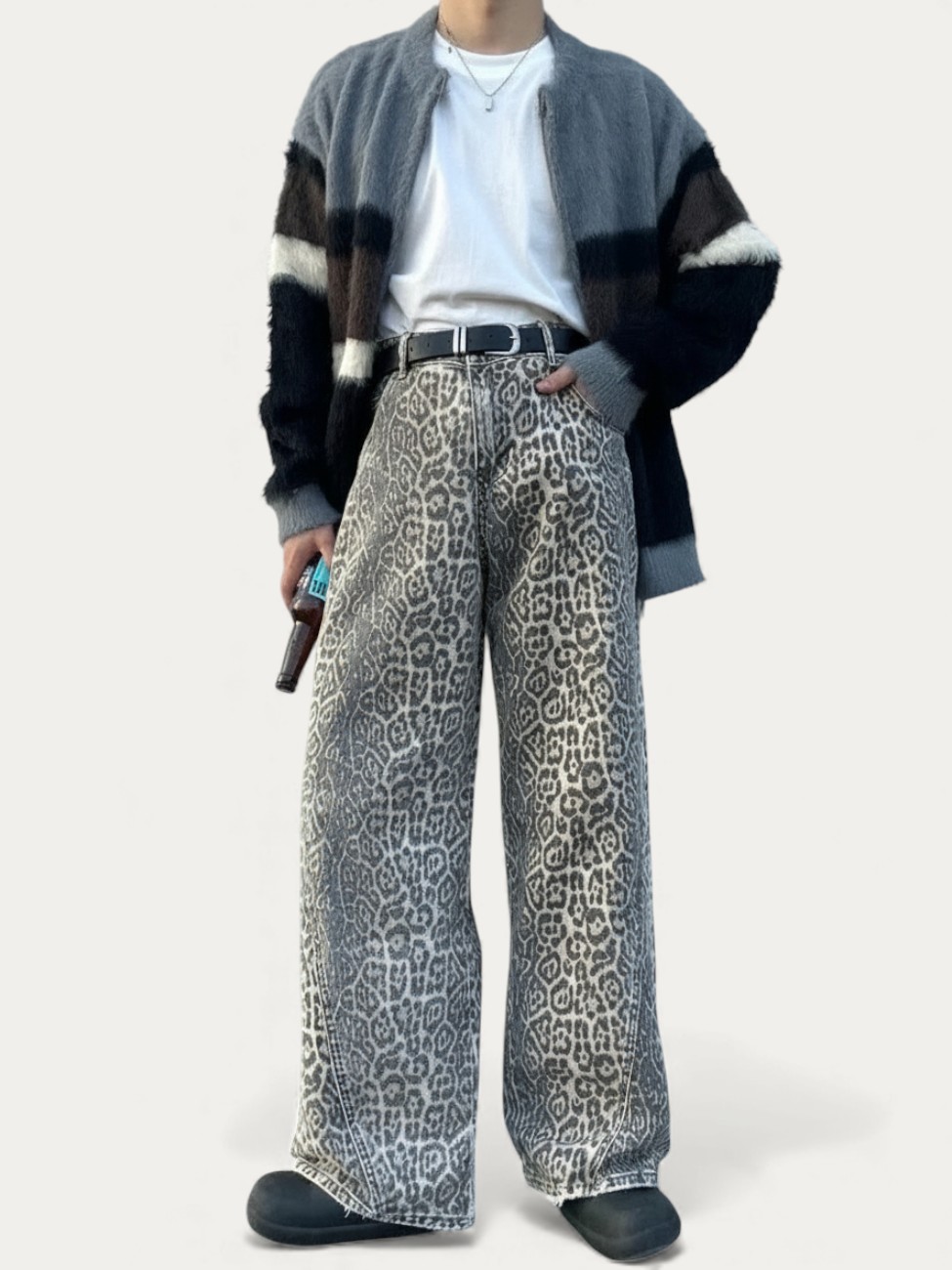Ce jean déploie une amplitude généreuse qui redéfinit immédiatement la posture. La coupe large glisse naturellement sur la chaussure, créant une ligne fluide qui met en valeur chaque mouvement. Le motif panthère, sublimé par un délavage irrégulier, apporte une dimension organique au denim.