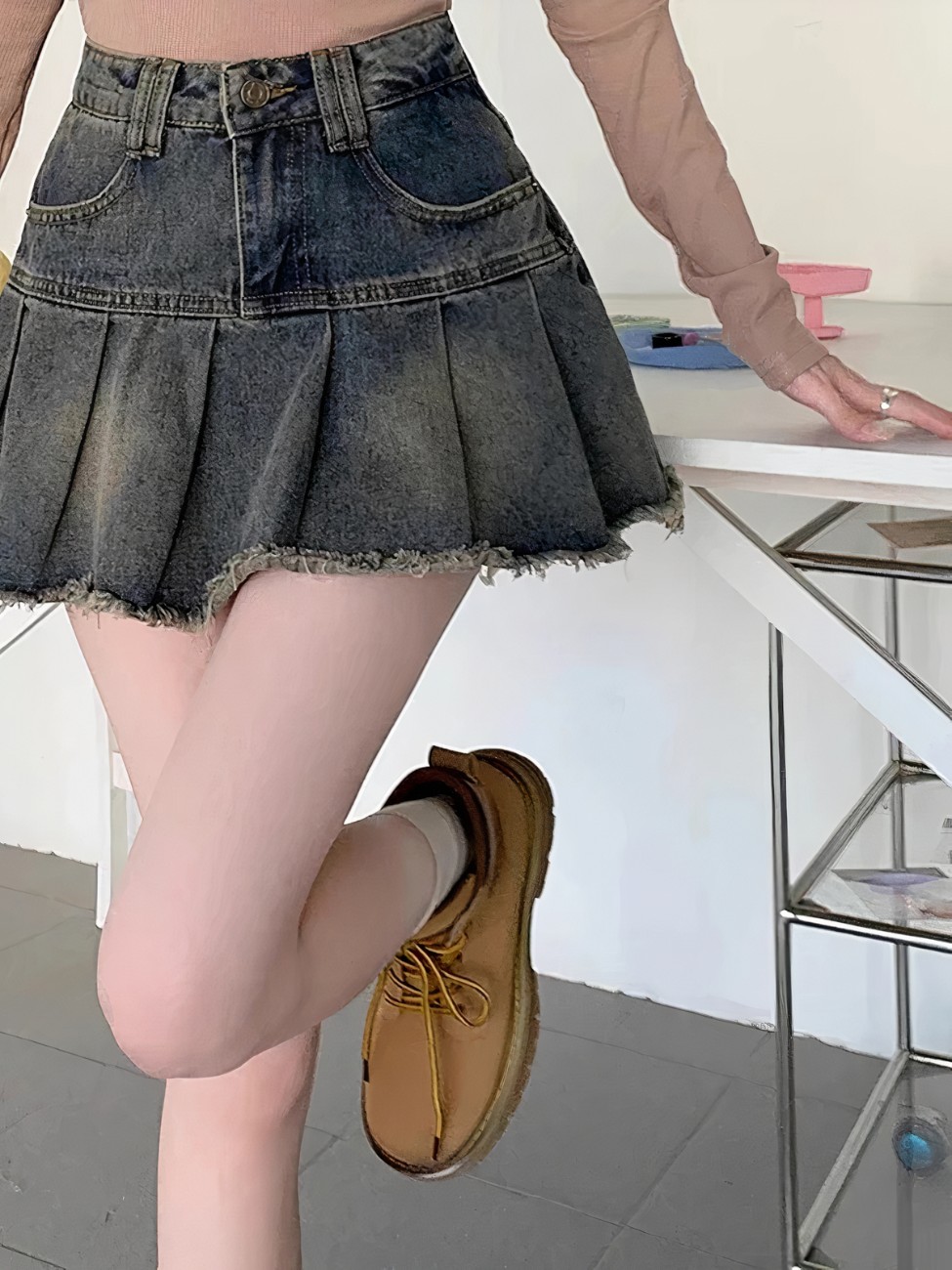 Elle tourne au rythme de vos pas, courte et plissée comme un clin d’œil aux codes pop ; la taille haute structure le look tandis que le denim rigide capte la lumière. Le délavage irrégulier rappelle ces heures passées à mixer crop top et blouson métallisé.