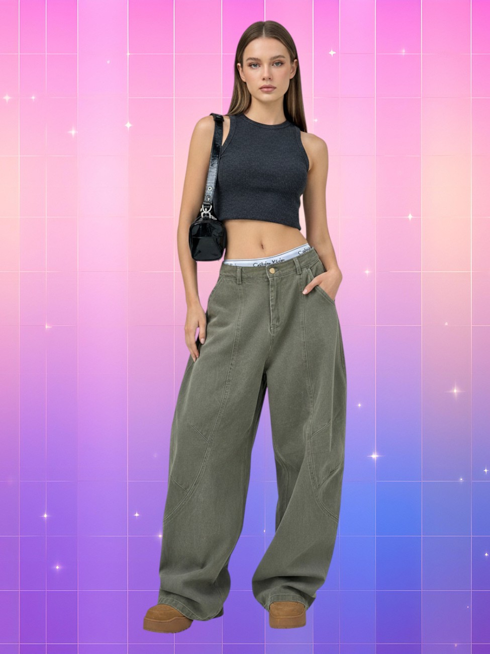 Ce modèle adopte une coupe largement évasée qui rappelle les silhouettes emblématiques des années marquées par des volumes extrêmes. La taille basse laisse apparaître subtilement l’élastique, renforçant une esthétique assumée.