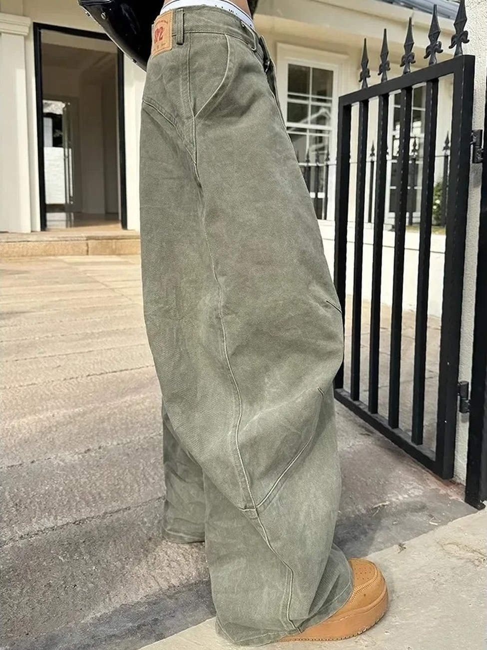 Le tissu kaki délavé apporte un caractère rétro affirmé, tandis que les lignes arrondies structurent visuellement la jambe. L’ensemble crée une allure contemporaine influencée par les tendances actuelles, idéale pour celles qui souhaitent exprimer une identité inspirée des codes rétro revisités.