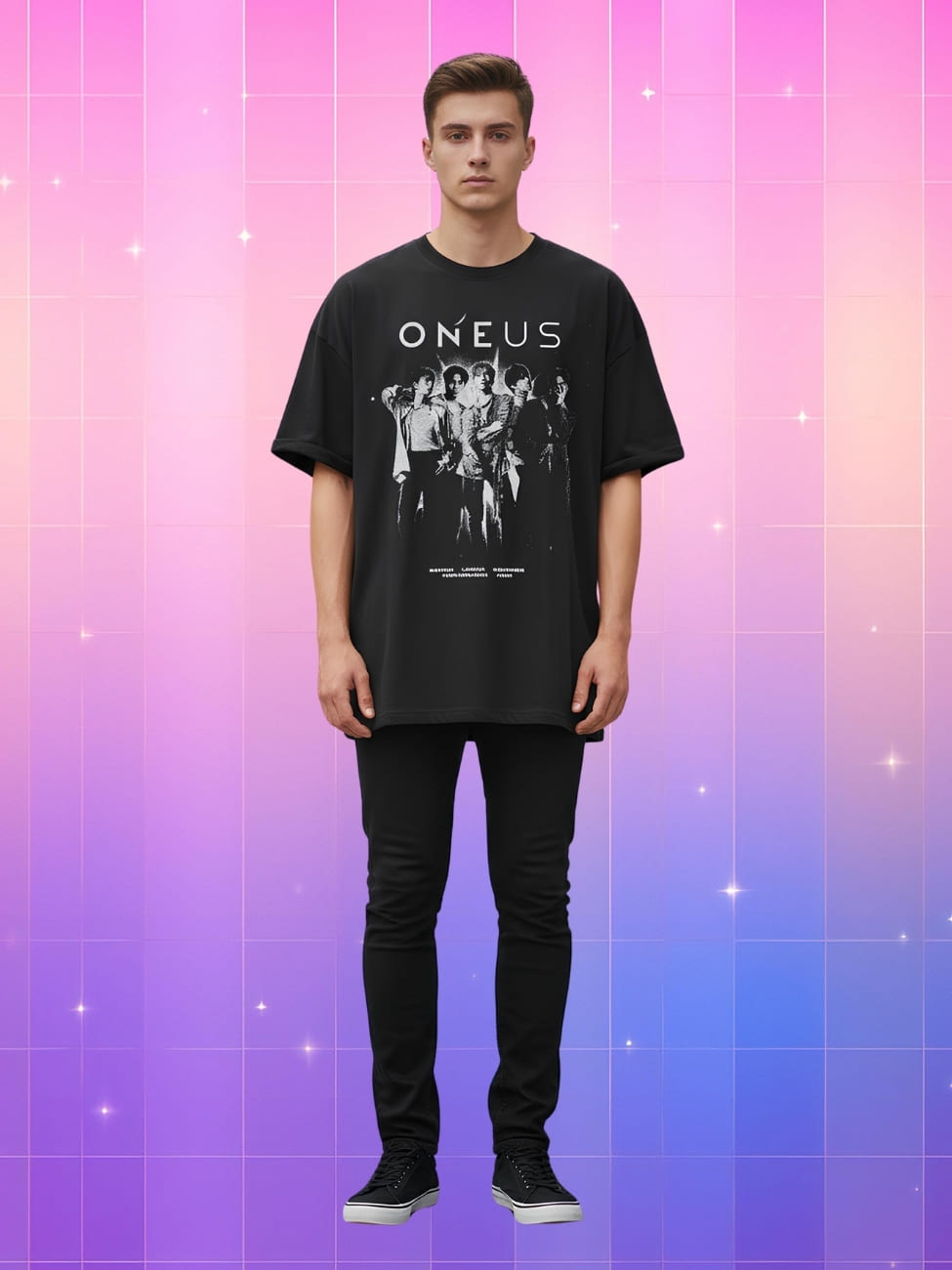 Ce t-shirt noir mise sur un contraste percutant : fond sombre, imprimé monochrome du groupe et logo ONEUS bien visible. Le rendu est moderne, urbain, parfaitement dans l’esthétique K-pop actuelle.