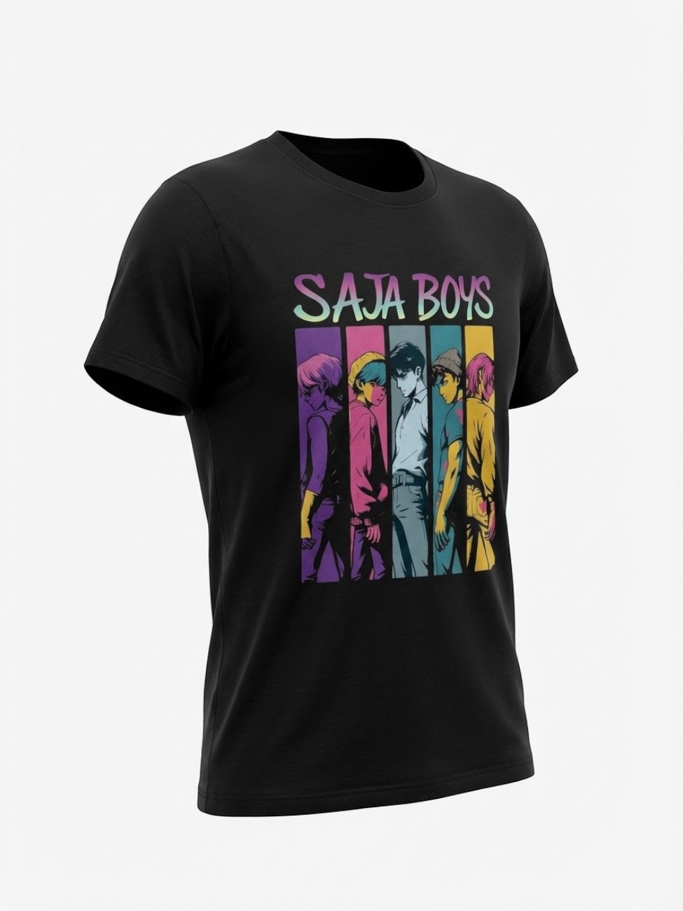 Cinq silhouettes, cinq énergies, cinq regards qui ne laissent personne indifférent. Ce vêtement est bien plus qu’un simple haut illustré : c’est un fragment de l’univers des Saja Boys, ces idoles aussi charismatiques que troublantes.