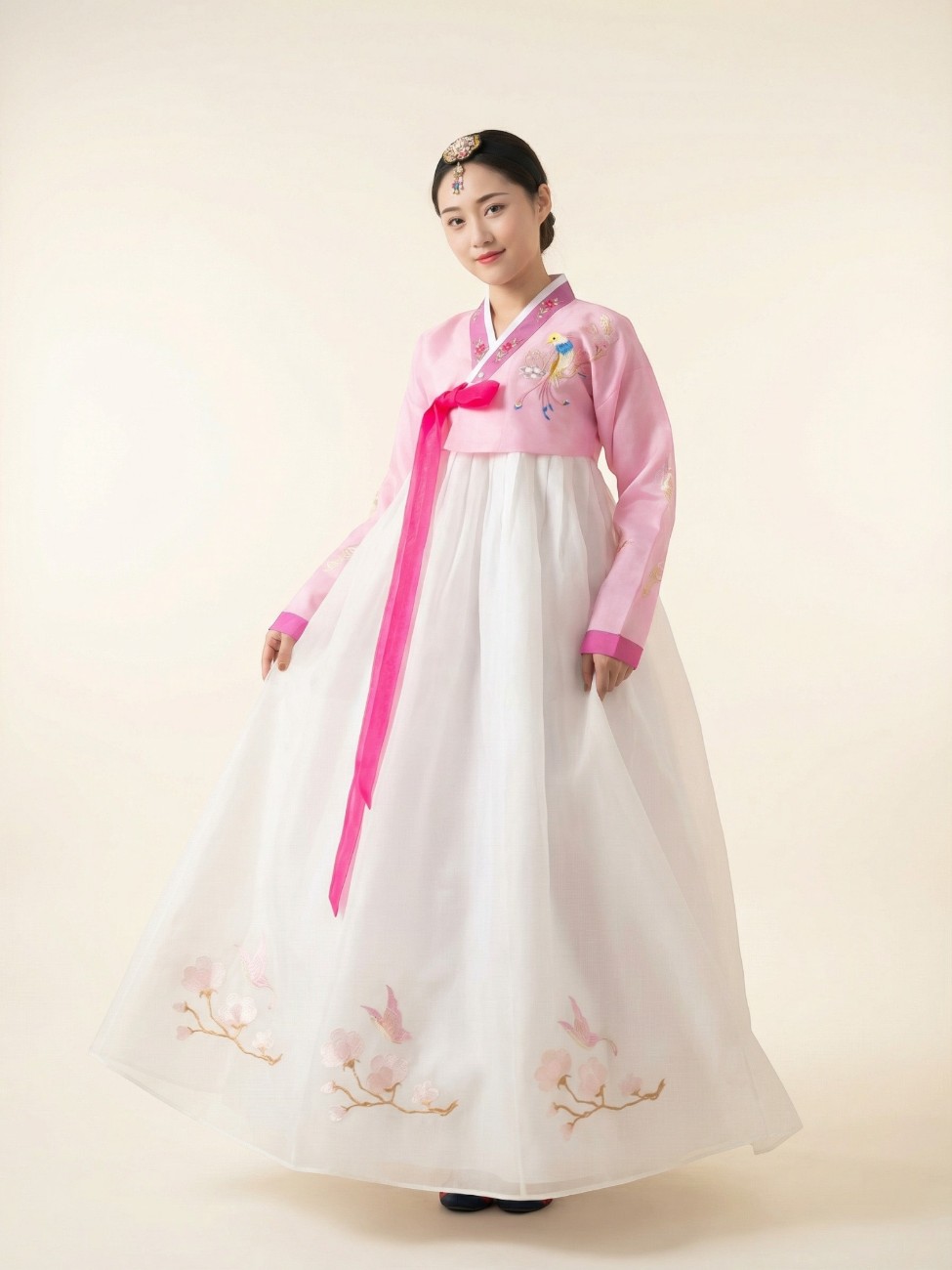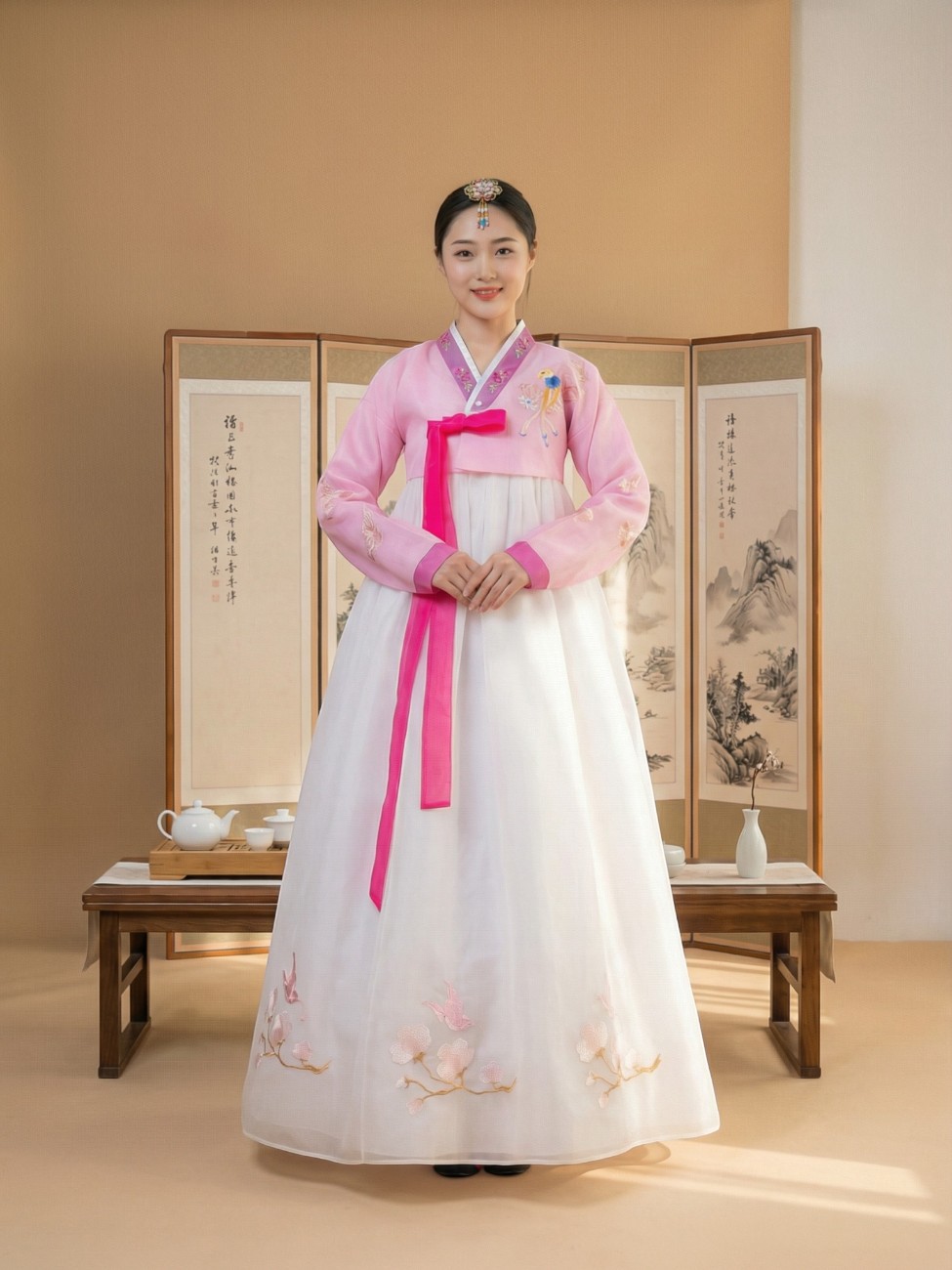 Le blanc, symbole de pureté en Corée, devient ici un support délicat pour les broderies poétiques. On ne porte pas ce hanbok pour paraître, mais pour ressentir. Pour se souvenir. Et pour transmettre, à son tour.
