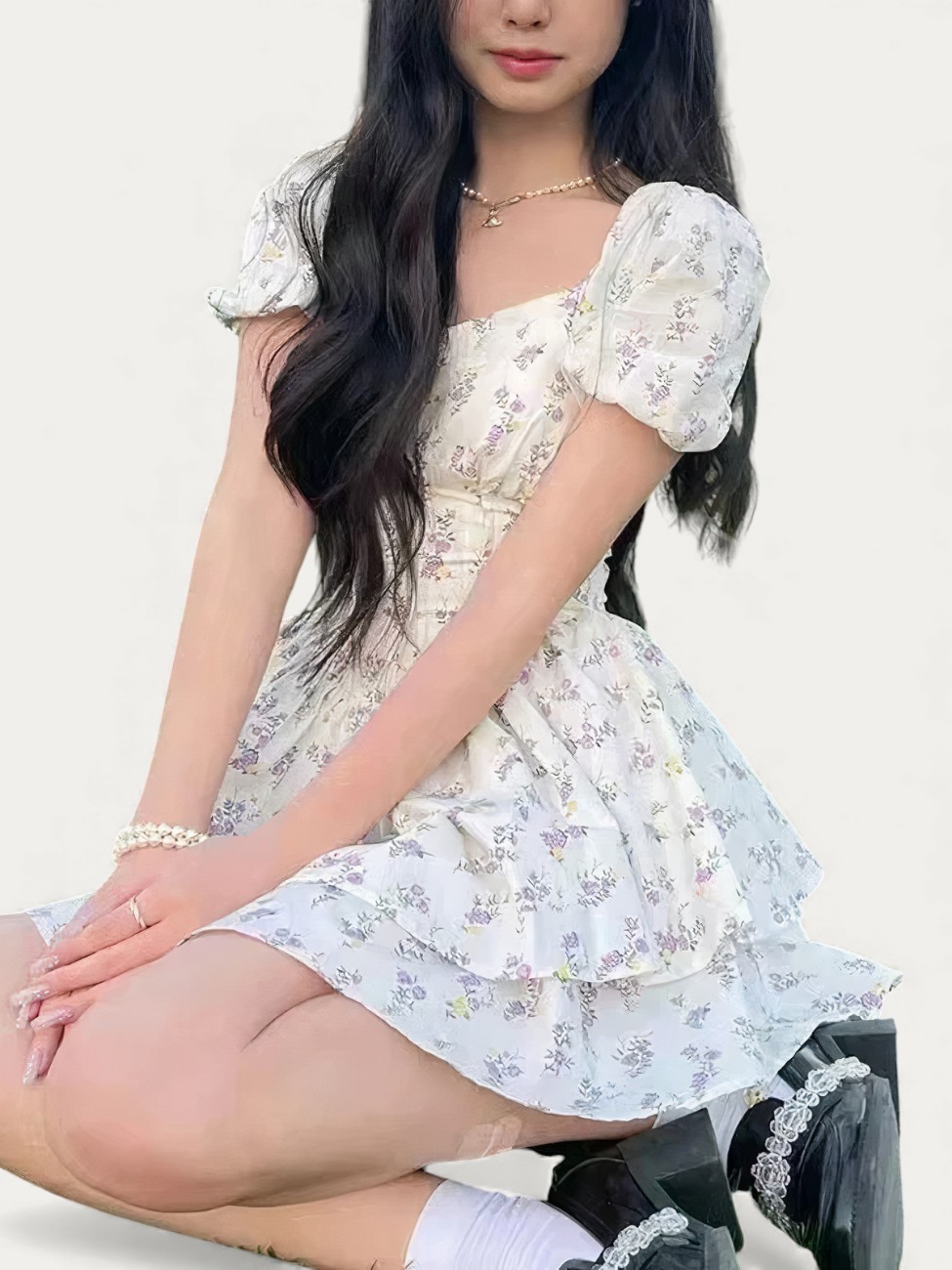 La robe coréenne courte s’offre dans un souffle : mi-cuisse, subtilement évasée, elle dévoile juste ce qu’il faut. Son imprimé floral semble cueilli dans un jardin de brume. La taille soulignée affine sans contraindre, créant un galbe fluide, délicat.