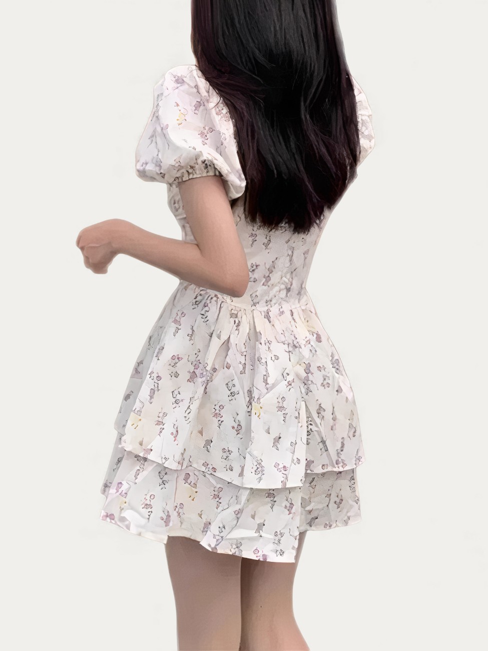 Elle n’a pas besoin de couleurs vives pour captiver. Sa palette évoque le matin, le silence d’un parc, la légèreté d’un souffle. En mouvement, les volants dansent, la jupe tourne, la silhouette s’efface presque dans la lumière.