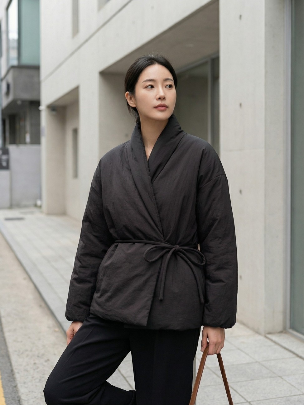 Dès l’enfilage, la sensation est immédiate : le corps se détend, la posture s’affirme. La coupe croisée inspire un vestiaire apaisé, tandis que le lien à nouer souligne la taille sans la contraindre. Le col souple encadre le cou avec douceur et crée une ligne protectrice. Dans cet équilibre entre structure et fluidité, l’allure se transforme.