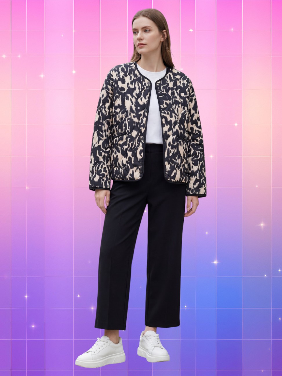 Elle capte l’attention dès le premier regard, sans jamais en faire trop. L’imprimé, inspiré des coups de pinceau abstraits ou des taches félines revisitées, crée un rythme visuel saisissant. Chaque élément, du col arrondi à la ligne d’épaule légèrement tombante, a été pensé pour magnifier la silhouette sans rigidité. L’équilibre entre expressivité et sobriété est maîtrisé.