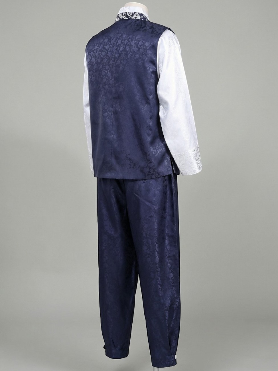 L’ensemble comprend trois pièces essentielles issues d’un savoir-faire codifié. La veste courte ajustée repose sur une chemise blanche légèrement texturée, tandis que le pantalon fluide assure une liberté de mouvement agréable. La matière en polyester allie confort moderne et apparence soyeuse.