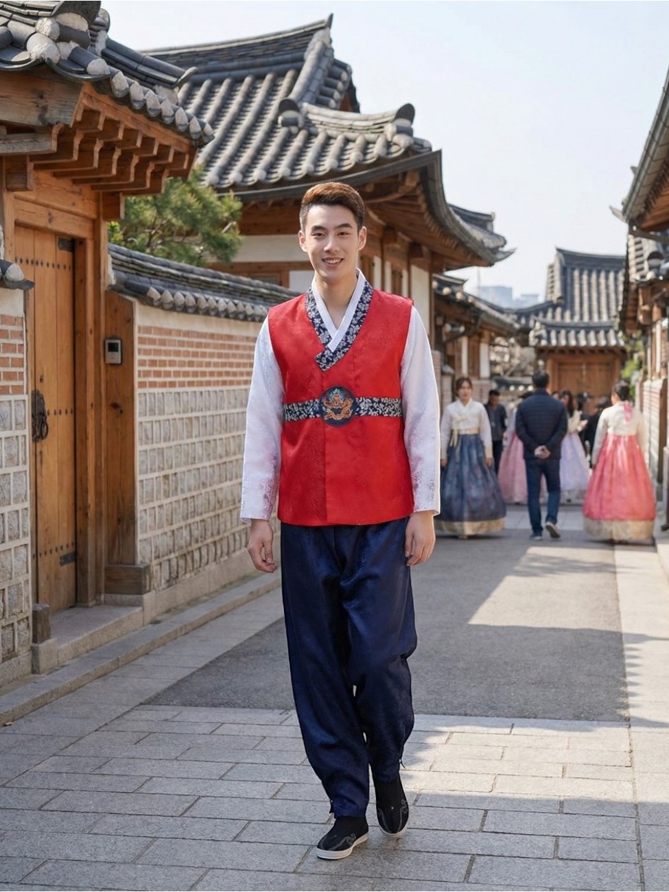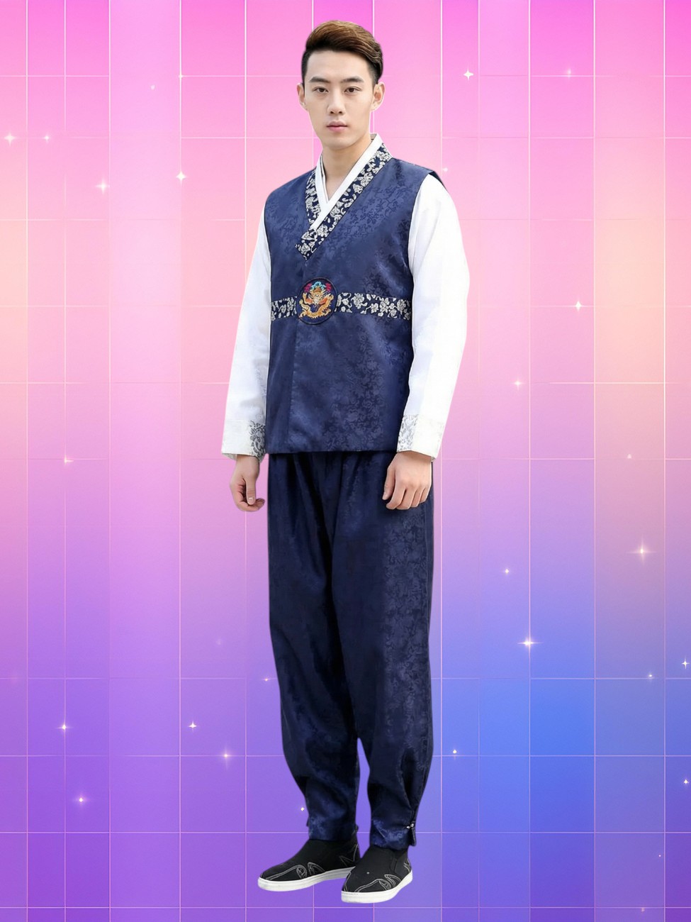 Bleu nuit, rouge carmin, ciel clair ou rose poudré, chaque teinte raconte sa propre histoire. Ce raffinement silencieux prend tout son sens au cœur de ce hanbok coréen pour homme, dans un geste entre mémoire et élégance.