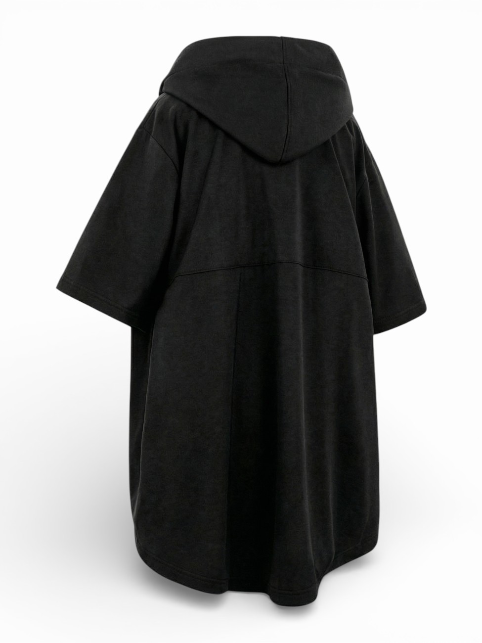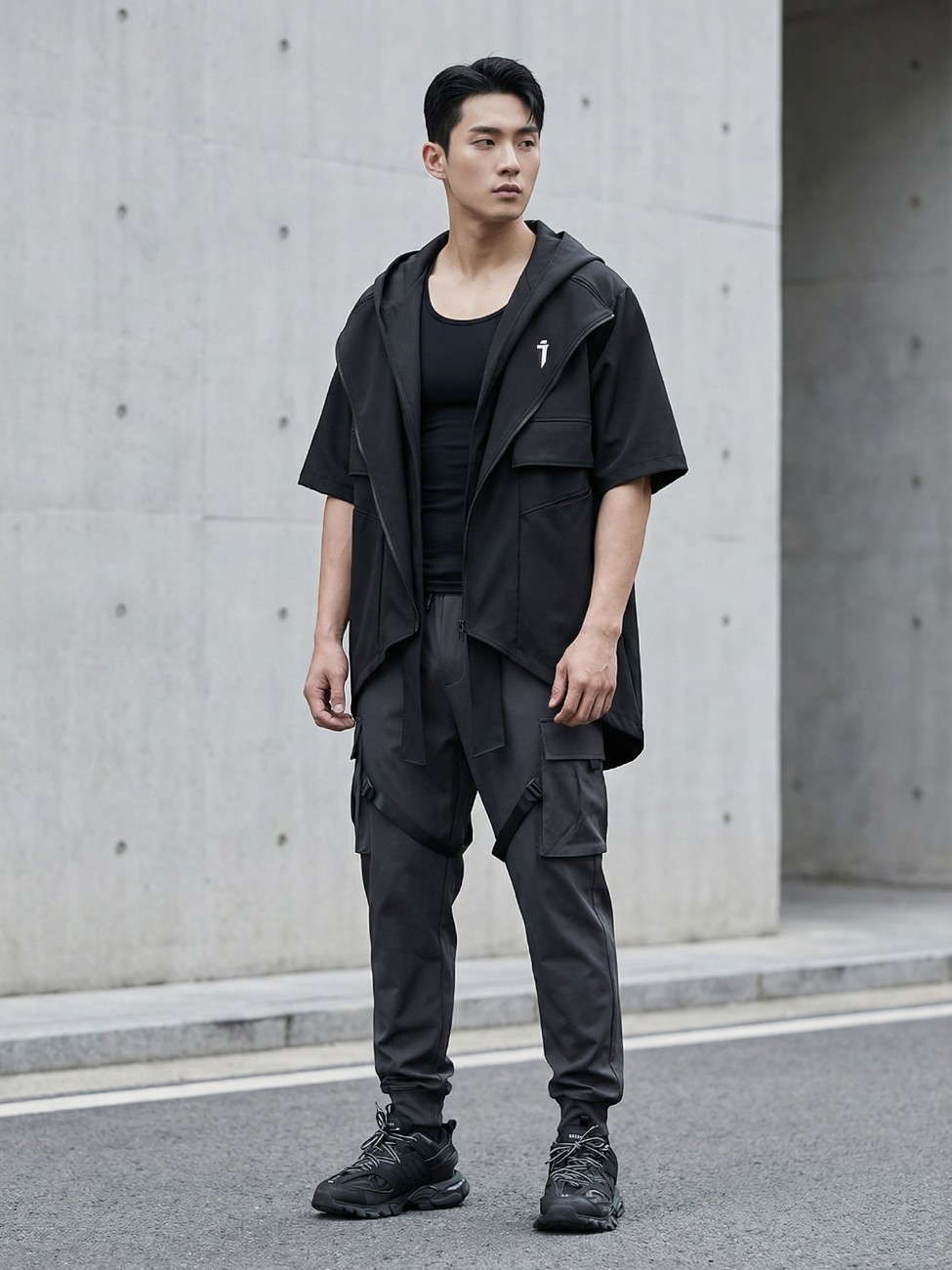 L’allure générale intrigue dès le premier regard. Mi-urbaine, mi-inspirée d’Asie, cette silhouette fait le lien entre les tenues de rue et les vêtements pensés pour le mouvement. Le zip central structure, la capuche apporte une dimension active, et les manches raccourcies libèrent le geste. On y retrouve l’essence du kimono, réinterprétée dans une architecture moderne.